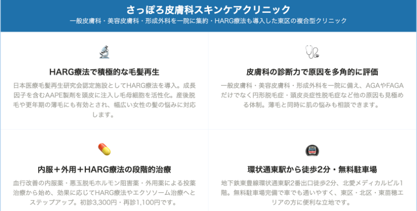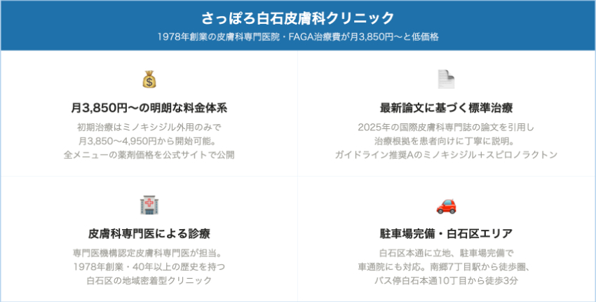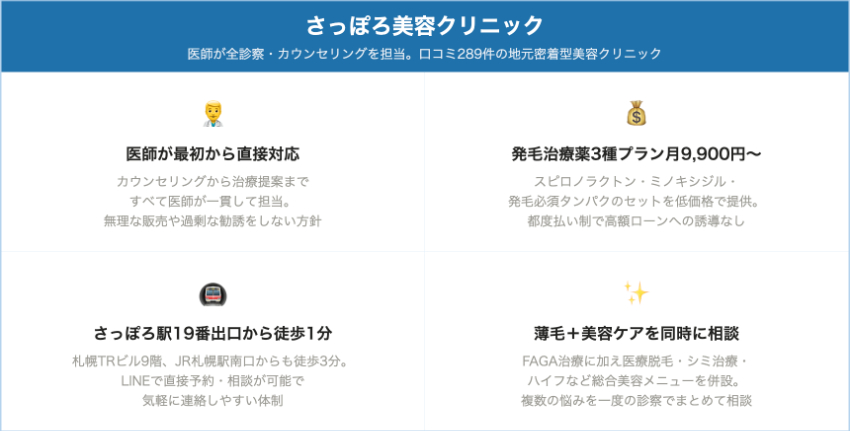 クレアージュ札幌・さっぽろ美容クリニック・さっぽろ白石皮膚科クリニックなど多くのクリニックでFAGA治療は自由診療(保険適用外)です。初診当日に採血・処方まで対応するクリニック(さっぽろ美容クリニックなど)もあれば、初回は診察と検査のみで次回から処方というステップを踏む院もあります。