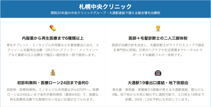 札幌中央クリニック中央区大通西2-5 都心ビル4F地下鉄大通駅19番出口直結薄毛・AGA・FAGA専門医師+毛髪診断士担当制無料相談時に確認相談時に確認4,620円/月〜(ミノキシジル外用)エクソソーム79,200円/回〜10:00〜18:00不定休現金・クレジットカード・電子マネー・医療ローン