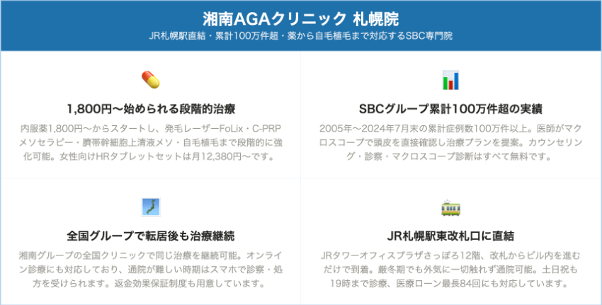 湘南AGAクリニック 札幌院中央区北5条西2-5 JRタワーオフィスプラザさっぽろ12FJR札幌駅直結/さっぽろ駅2番出口直結AGA・FAGA専門SBCグループ専門医無料無料無料5,940円/月〜(オンライン・タブレットML)FoLix・毛根再生注射(相談時に確認)EXOHAIR EVs(相談時に確認)あり(相談時に確認)効果保証制度あり(条件あり)あり(再診から)10:00〜19:00不定休現金・クレジットカード・デビットカード・銀行振込・医療ローン