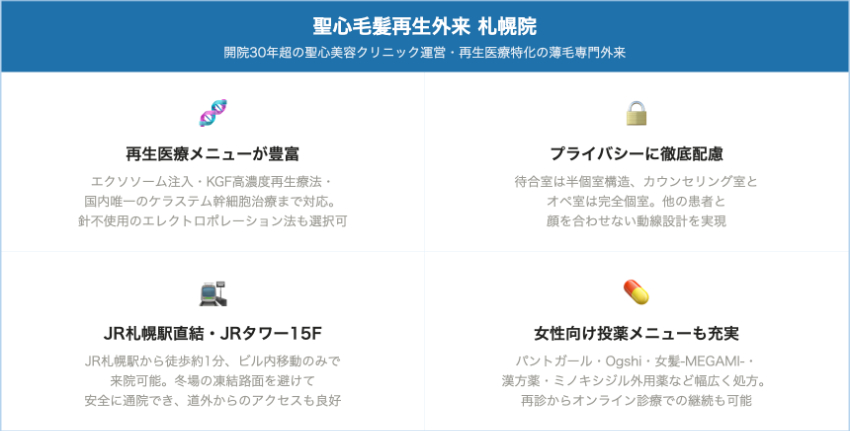 聖心毛髪再生外来 札幌院中央区北5条西2-5 JRタワーオフィスプラザさっぽろ15FJR札幌駅直結(徒歩約1分)AGA・FAGA専門聖心美容クリニックグループ無料相談時に確認相談時に確認相談時に確認プレミアムグロースファクター再生療法71,500円/回〜EXOHAIR EVs(相談時に確認)あり(再診から)10:00〜19:00土日祝(要確認)現金・クレジットカード・医療ローン(相談時に確認)