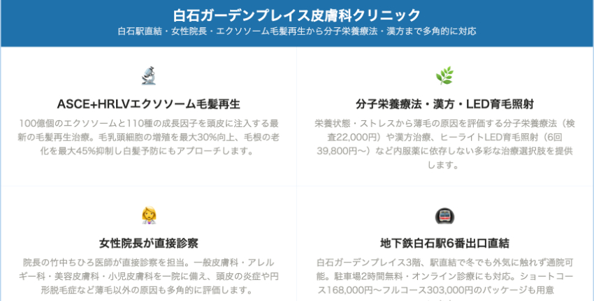 クリニック名所在地最寄り駅・アクセス診療科目院長・医師の特徴女性医師対応カウンセリング初診料再診料FAGA女性向け内服薬メソセラピー・注入治療エクソソーム療法自毛植毛人工毛植毛ヒーライトLED返金・効果保証オンライン診療駐車場漢方治療分子栄養療法診療時間休診日子連れ対応支払い方法