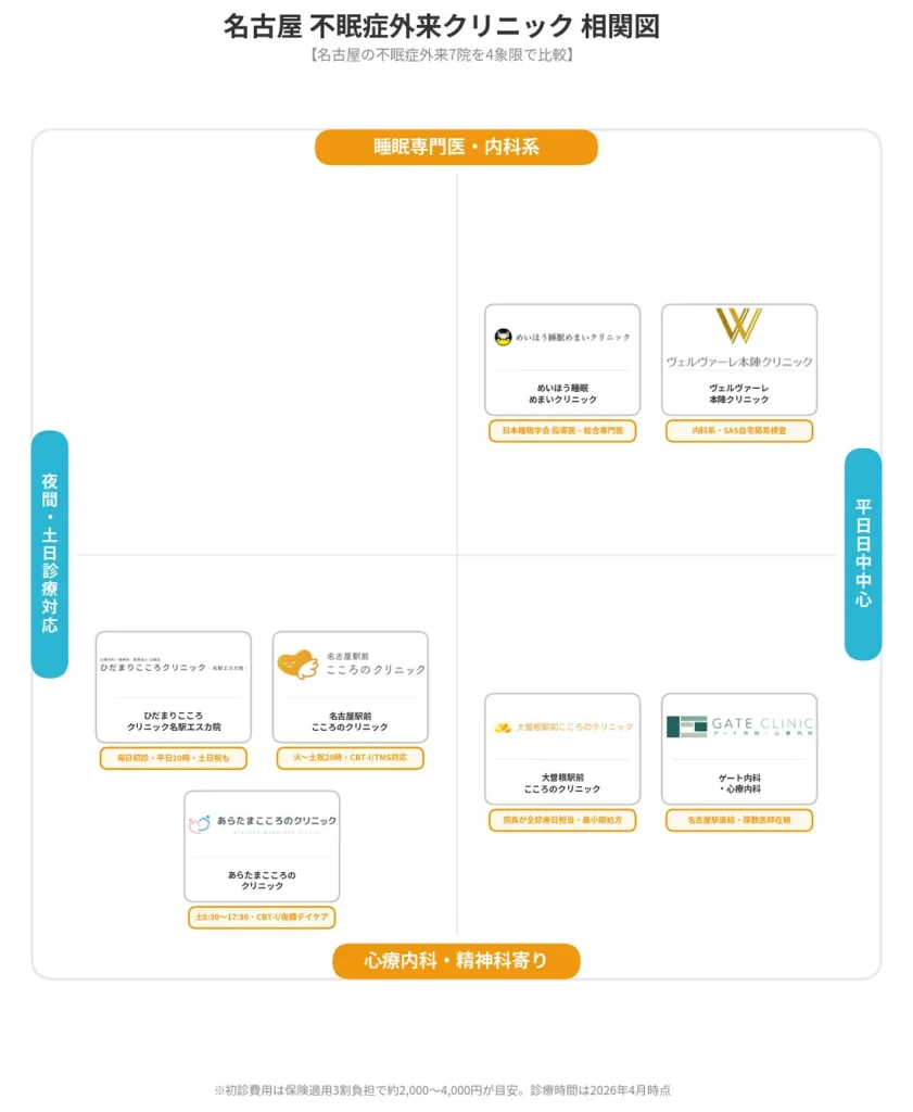 薬に頼らないCBT-Iや認知行動療法を重視するならあらたまこころのクリニック・名古屋駅前こころのクリニック、費用の透明性を重視するなら大曽根駅前こころのクリニック(公式サイトに料金明記)、睡眠専門医への受診を希望するならめいほう睡眠めまいクリニック、身体疾患との合併が心配な方にはヴェルヴァーレ本陣クリニックが向いています。