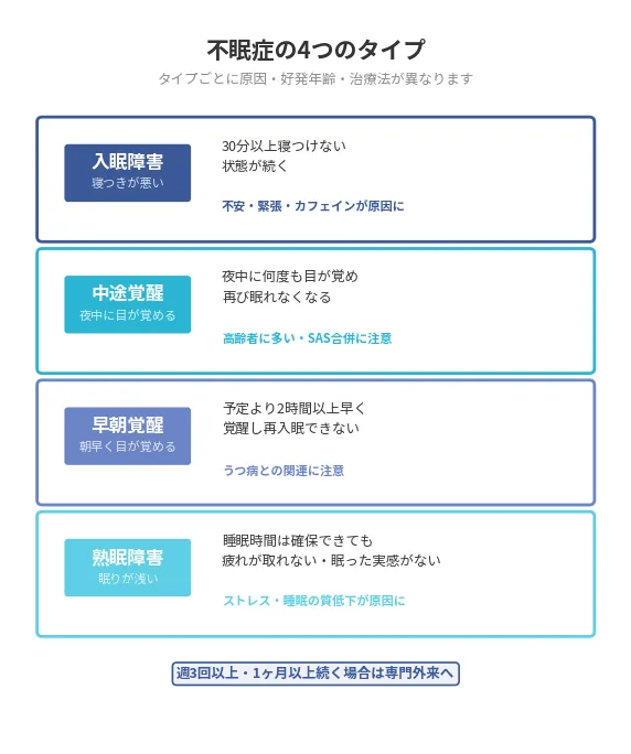 診断の結果、不眠症のタイプ(入眠障害・中途覚醒・早朝覚醒・熟眠障害)と考えられる原因が説明されます。