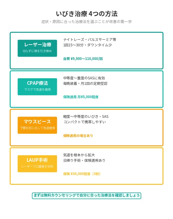 いびきの治療法は、症状の原因・重症度・ライフスタイルに応じて選択されます。それぞれの治療法には適した症例と注意点があるため、医師との相談のうえで決定することが重要です。