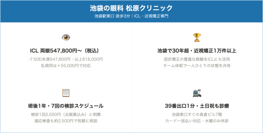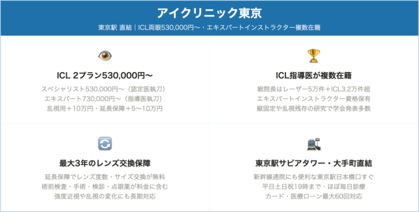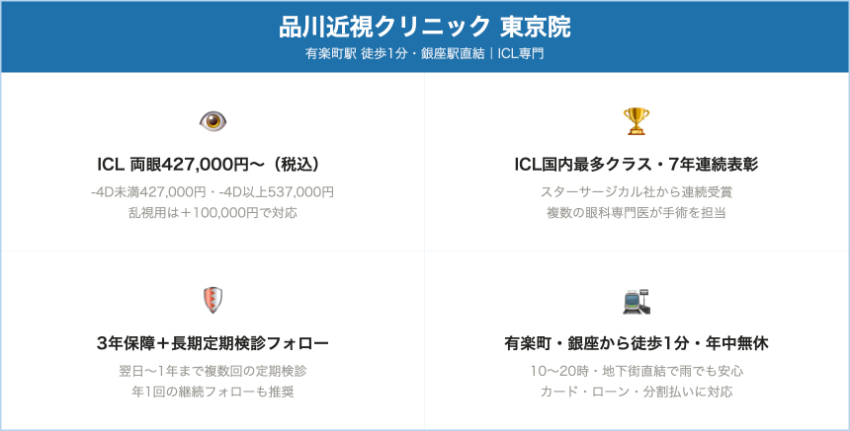 東京でICL手術を検討する際は、手術当日だけでなく、この長期フォローまで含めて通いやすいエリア・ICLクリニックを選ぶことをおすすめします。