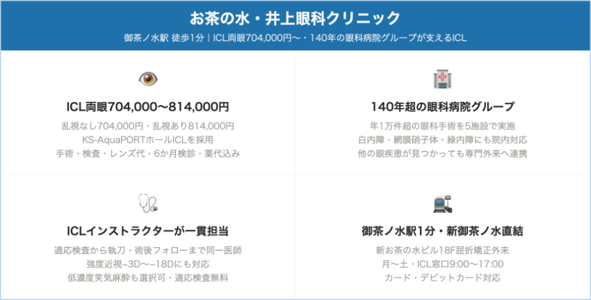 | 井上眼科病院/お茶の水・井上眼科クリニック | 御茶ノ水 | 704,000円(片眼352,000円×2) | 814,000円(片眼407,000円×2) | 適応検査無料、手術前検査・レンズ代・術後6か月の定期検診・薬剤料込み。KS-AquaPORT採用。 |