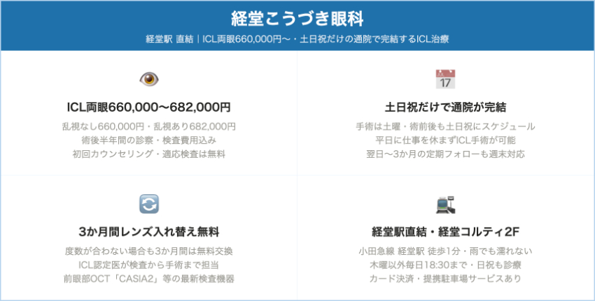 | 経堂こうづき眼科 | 経堂(経堂コルティ直結) | 660,000円 | 682,000円 | 術後半年の診察・検査込み、レンズ入れ替えは術後3か月無料。土日祝のみで完結プランが特徴。 |