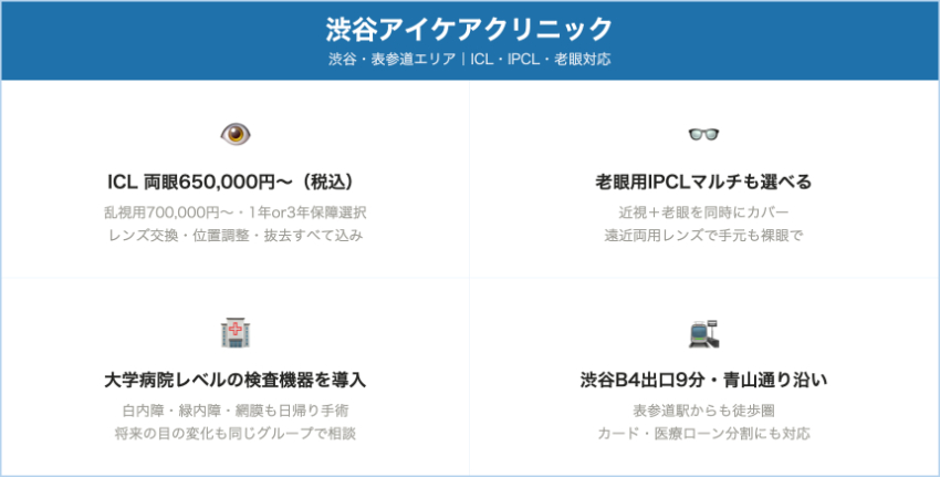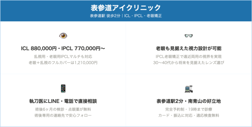 | 表参道アイクリニック | 表参道(表参道駅徒歩2分) | 880,000円(ICL) | 990,000円 | 術後6か月検診・点眼薬無料、執刀医にLINE/電話で相談可。IPCL(老眼対応)もあり。 |
