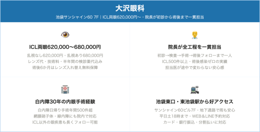| 大木眼科 | 池袋西口 | 680,000円 | 720,000円 | 術前検査+術後検査セット10,000円、術後3か月までの検査・薬剤費&6か月以内のICL交換費込み。 |
