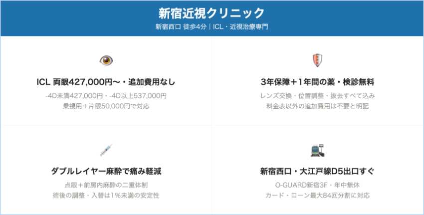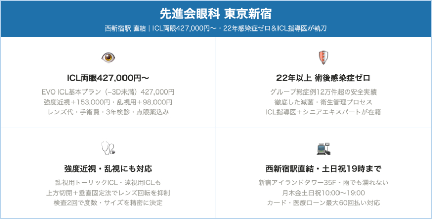 | 先進会眼科 東京新宿 | 西新宿(西新宿駅直結) | 約427,000円〜580,000円 | 約525,000円〜678,000円 | EVO ICL採用、3年保障・術後検診3年無料。 |