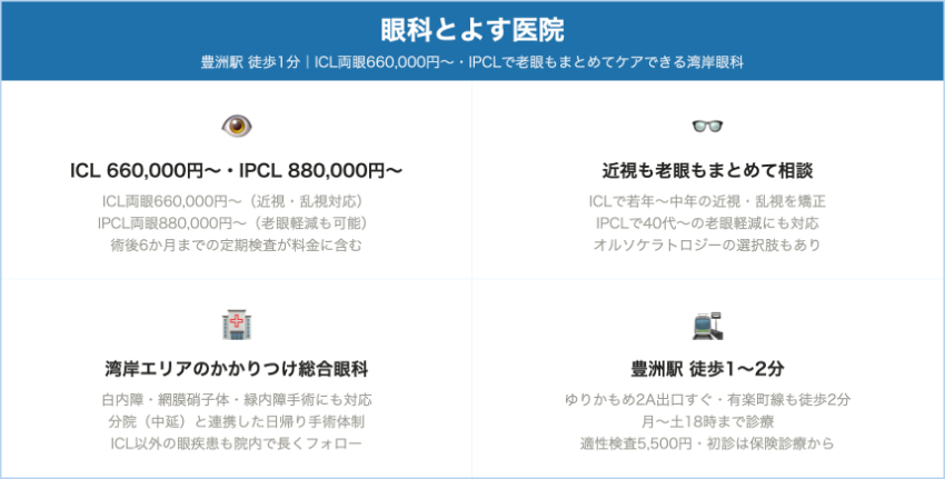 | 眼科とよす医院 | 豊洲(豊洲駅徒歩1〜2分) | 660,000円〜 | ―(レンズにより変動) | ICL両眼660,000円〜、IPCL両眼880,000円〜。術後6か月までの定期検査料込み。 |
