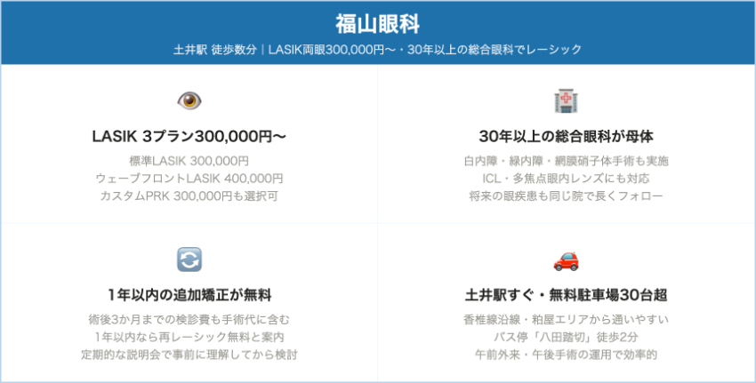| 福山眼科 | 福岡市東区 土井 | LASIK:300,000円 | 300,000〜400,000円(LASIK 30万円/ウェーブフロントLASIK 40万円/カスタムPRK 30万円) | 標準LASIK/ウェーブフロントLASIK/カスタムPRK など、角膜形状に応じた屈折矯正手術を実施。 | 手術費に術後3か月までの検査費を含む。1年以内の追加矯正(再レーシック)無料と紹介。 |