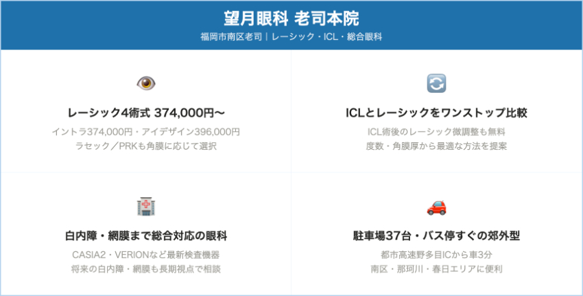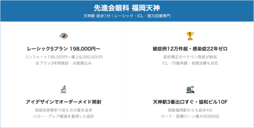 総じて、「福岡・天神で、実績と衛生管理に配慮した専門クリニックでレーシック手術やICLを検討したい人」に、候補として押さえておきたい一院と言えるでしょう。
