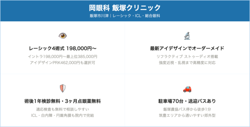 | 岡眼科 飯塚クリニック | 飯塚市 川津 | iFSイントラレーシック:198,000円 | 約198,000〜462,000円(iFSイントラ〜アイデザインPRK) | iFSイントラレーシック/アイデザイン アイレーシック(308,000円)/アイデザイン リフラクティブ ストゥーディオ(385,000円)/アイデザインPRK(462,000円) | iFSは1年保証、アイデザイン系・PRKは3年保証。術後1年の検診無料・3か月の点眼薬無料など、アフターケア内容も公式に明示。 |
