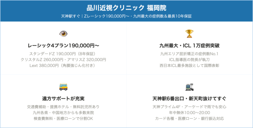 費用を抑えつつ、実績と保証がそろった大手専門院でレーシックを受けたい人には、品川近視クリニック 福岡院が特に向いています。
