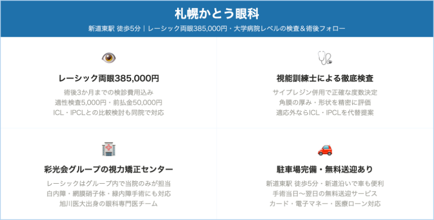 新道東エリアに位置し、車でも地下鉄でも通いやすい一方で、レーシックだけでなくICL・IPCLや白内障手術まで同じグループで完結できるのは大きな安心材料です。
