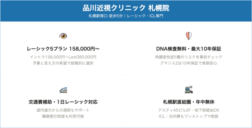 札幌駅周辺と東区エリアでレーシック手術に対応している主なクリニックについて、代表的なプラン内容や料金、検査費用、保証・アフターケアを比較しやすいよう一覧表にまとめました。