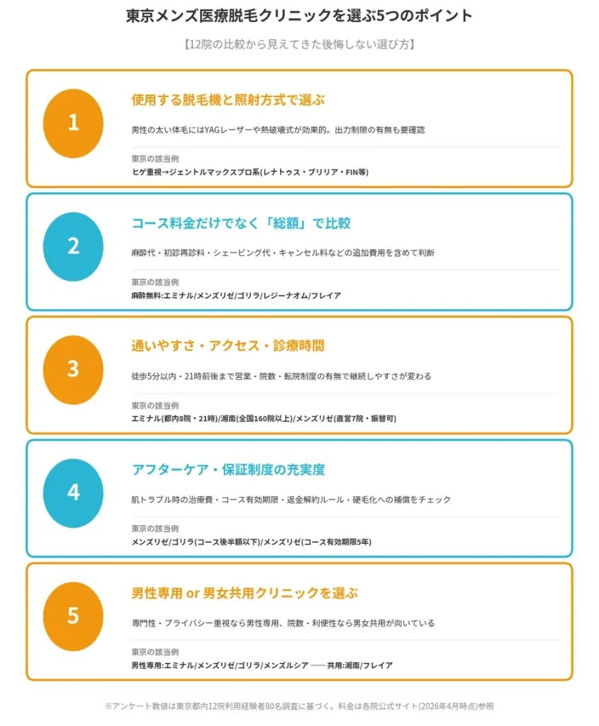 料金だけでなく、男性専用かどうか・麻酔の有無・脱毛機の種類・東京院数・診療時間を総合的に比較することが後悔のないクリニック選びにつながります。