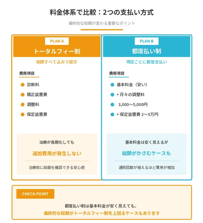基本料金が安く見えても調整料が別途かかる都度払い制では、治療期間が長くなるほど総額が膨らむ可能性があります。