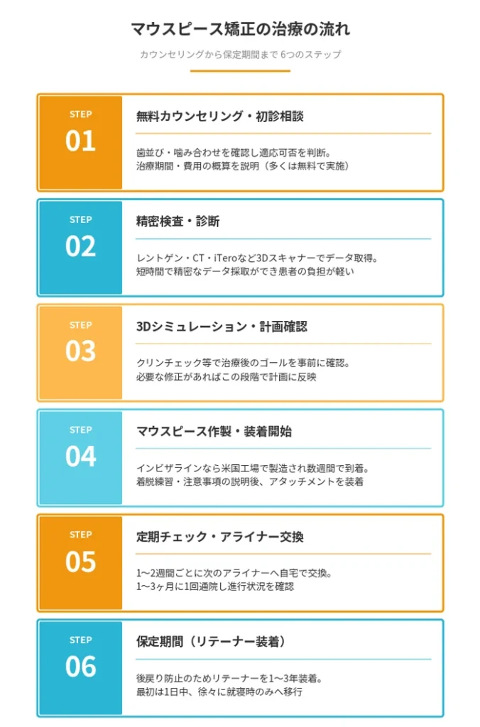 マウスピース矯正は「相談から治療開始まで」に複数のステップを経るため、全体の流れを事前に把握しておくことが大切です。
