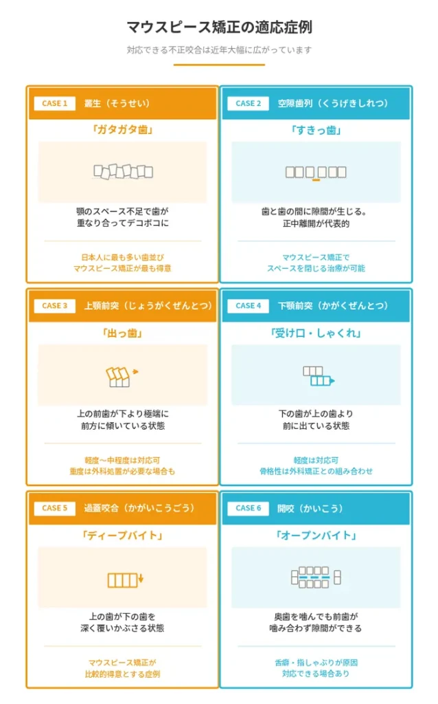 マウスピース矯正でも対応できる症例は年々拡大していますが、最重度の骨格的問題にはワイヤー矯正や外科矯正が適しています。