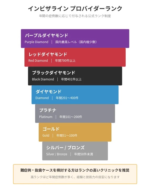 - インビザライン・プロバイダーランク(ダイヤモンド・ブラックダイヤモンド・パープルダイヤモンドなど)の有無