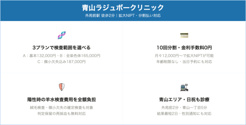 | 青山ラジュボークリニック | 非認証 | A(シンプル)プラン:13・18・21トリソミー+性染色体検査(性別通知可) | 132,000円(税込) – Aプラン(B:165,000円/C:187,000円など) | Aプラン以上で陽性時の羊水・絨毛検査費用を全額負担(条件あり) | 外苑前駅徒歩2分・青山一丁目駅徒歩5分(港区) |