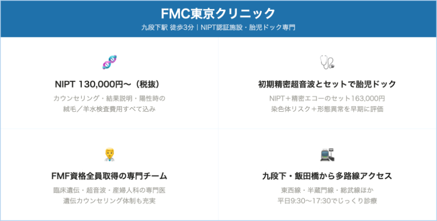 | FMC東京クリニック | 認証施設 | 13・18・21トリソミーNIPT(遺伝カウンセリング+結果説明込み) | 130,000円(税込) – NIPT+カウンセリング+結果説明 | 当院でNIPT陽性となった場合、絨毛・羊水検査の費用は無料 | 九段下駅徒歩3〜5分/飯田橋駅徒歩8分(千代田区) |