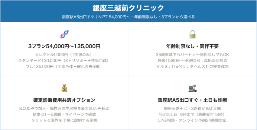 | 銀座三越前クリニック | 非認証(無認可施設と明記) | スタンダードプラン:13・18・21トリソミー+性染色体異数性(単胎/双胎) | 120,000円(税込) – スタンダードプラン | 確定診断費用共済(8,000円)加入で羊水検査費用を最大20万円まで補助 | 銀座駅A5出口すぐ(中央区) |