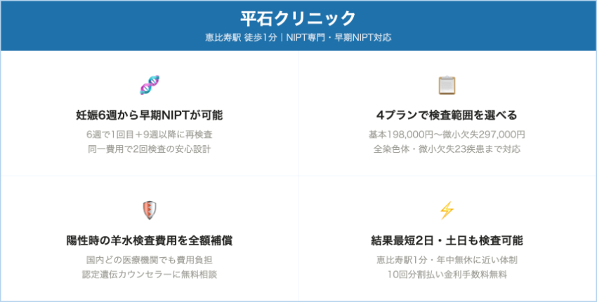 | 平石クリニック(平石こどもクリニック) | 非認証 | 基本検査:13・18・21トリソミー+性染色体検査+性別判定 | 198,000円(税込) – 基本検査(全染色体・微小欠失は上位プラン) | 陽性時の羊水検査費用を全額補償と公式に案内 | 恵比寿駅徒歩1分(渋谷区)ほか全国提携院 |