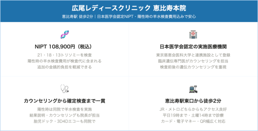東京でNIPTを受ける際に、専門性とアフターケアを重視したい人にとって、広尾レディースクリニック 恵比寿本院は有力な選択肢です。