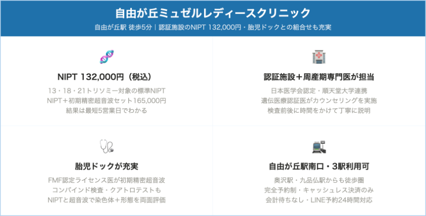| 自由が丘ミュゼルレディースクリニック | 認証施設 | 13・18・21トリソミーNIPT(単胎・双胎同額) | 132,000円(税込) – NIPTのみ | 陽性時の確定検査は連携病院で実施(一部費用サポートありと案内) | 自由が丘駅南口徒歩5分/奥沢6丁目(世田谷区) |