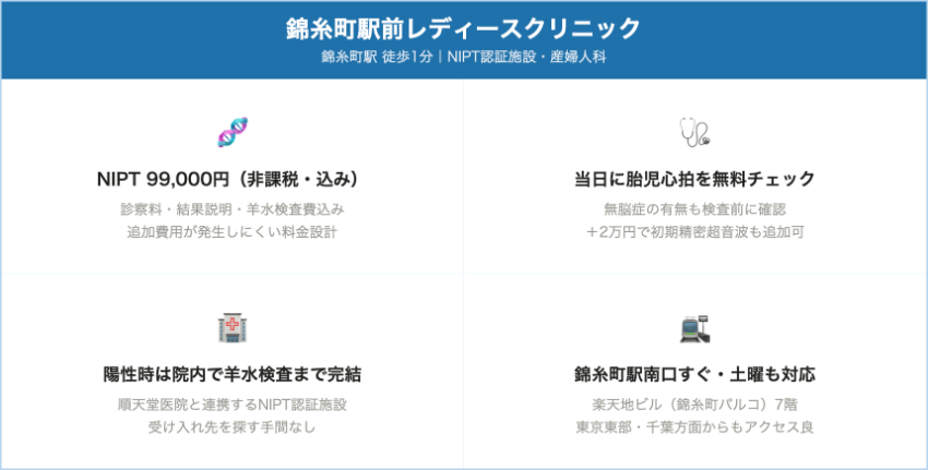 | 錦糸町駅前レディースクリニック | 認証施設 | 13・18・21トリソミーNIPT(診察+結果説明込み) | 99,000円(非課税) – NIPT単体 | 陽性時の羊水染色体検査無料(費用込み) | 錦糸町駅徒歩1分(墨田区) |