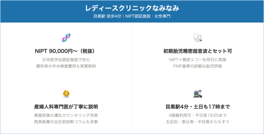 NIPTだけでなく初期胎児精密超音波もきちんと受けて、妊娠初期から赤ちゃんの状態を総合的にチェックしたい人にとって、検査内容・アクセス・費用の三拍子がそろった有力な一院として候補に入れておきたいクリニックです。