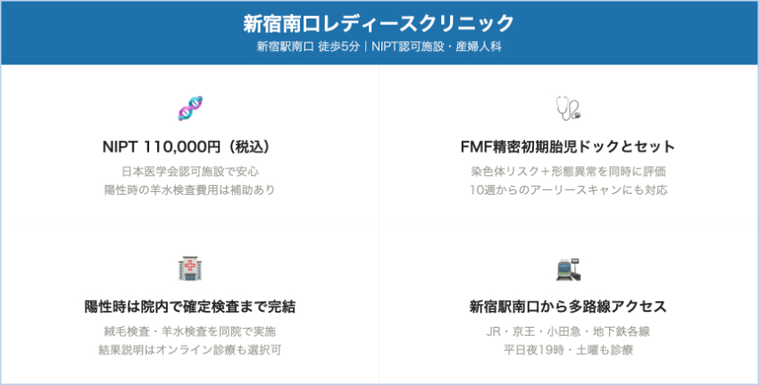| 新宿南口レディースクリニック | 認証施設 | FMF精密初期胎児ドック+13・18・21トリソミーNIPTのセット(SPRINT-LP) | 137,500円(税込) – 初期胎児ドック+NIPTセット | 陽性/判定保留時の羊水検査(QF-PCR+G-band)の検査費用が検査会社負担になる仕組みあり | 新宿駅南口徒歩約5分(渋谷区) |