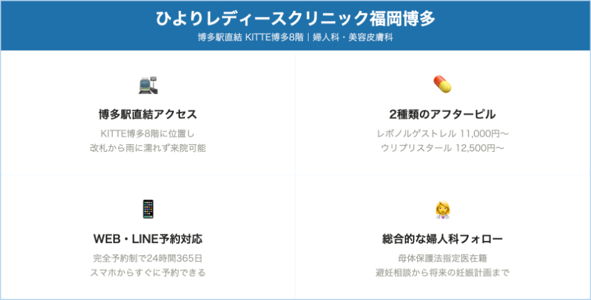 | ひよりレディースクリニック福岡博多 | 博多駅直結/KITTE博多8F | レボノルゲストレル 11,000円 | ウリプリスタール 12,500円 | 初診料2,200円別途 → 初回約13,200円〜 | 博多駅直結で通いやすく、中絶や不妊まで含めた婦人科フォローが手厚い。吐き気止め無料。 |