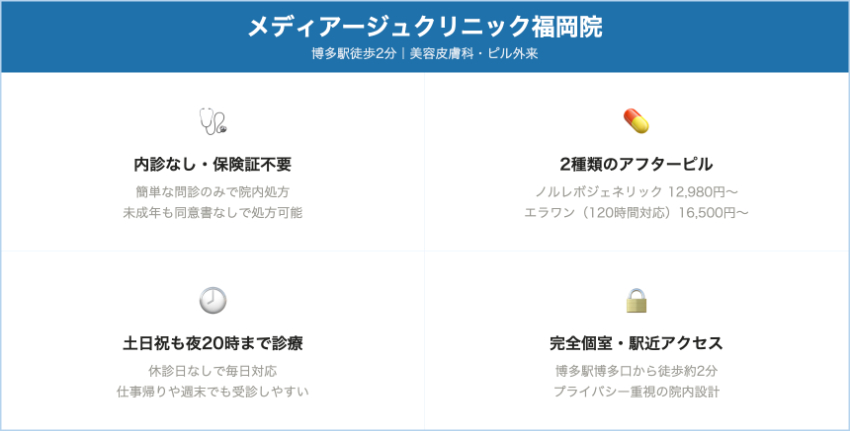 | 薬院天神南さくらクリニック | 薬院・渡辺通・天神南 | プラノバール4錠 2,500円/レボノルゲストレル1錠 7,000円 | なし | 初診料3,000円別途 → レボ使用時は初回約10,000円 | 内科+美容皮膚科。土日も診療・平日土曜は20時までで、薬院・天神南エリアで夜に動きたい人向け。 |