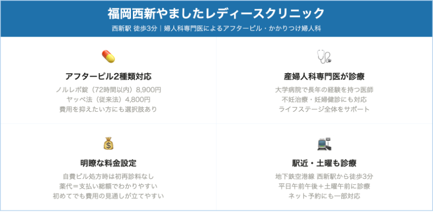 | 福岡西新やましたレディースクリニック | 西新駅徒歩3分 | ノルレボ 8,900円 | ヤッペ法 4,800円(中用量ピル2回法) | 自費ピルは初再診料なし → 薬代=総額 | 西新の婦人科。不妊治療も含めた地域のかかりつけ。費用を抑えたい人はヤッペ法も選べる。 |