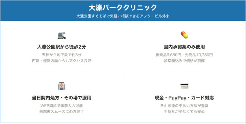| 大濠パーククリニック | 大濠公園駅徒歩2分 | レボノルゲストレル後発品 9,680円(診察込)/ノルレボ 10,780円(診察込) | なし | 上記価格が診察・薬代込み総額 | 公園すぐそばの落ち着いた環境。院内でその場内服。天神より少し離れても静かな場所で受診したい人向け。 |