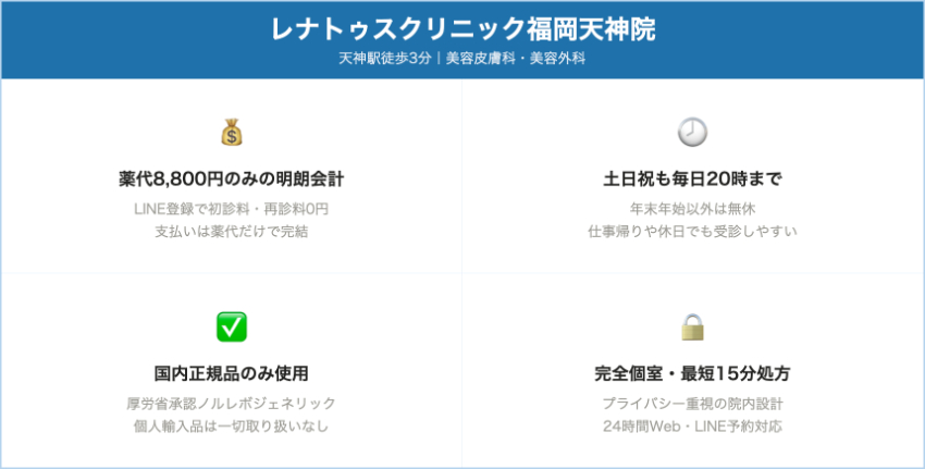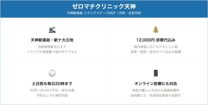 | レナトゥスクリニック福岡天神院 | 天神・西通り/いちご天神シティビル5F | レボノルゲストレル(国内正規) 8,800円 | なし | LINE予約で初診・再診料0円 → 初回も8,800円 | 美容クリニック内のピル外来。土日祝も20時までで「正規品×安さ」を重視する人向け。 |