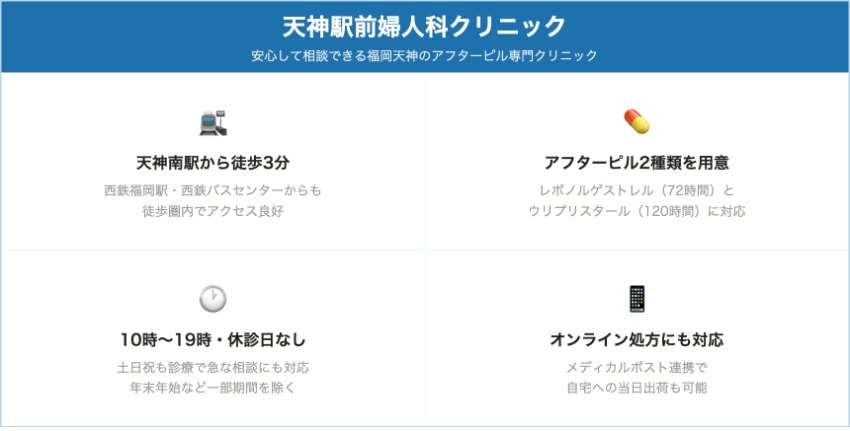 診療時間は10時から19時までで、休診日なしと案内されており、天神エリアで急にアフターピルが必要になった人にとって心強い選択肢といえます。