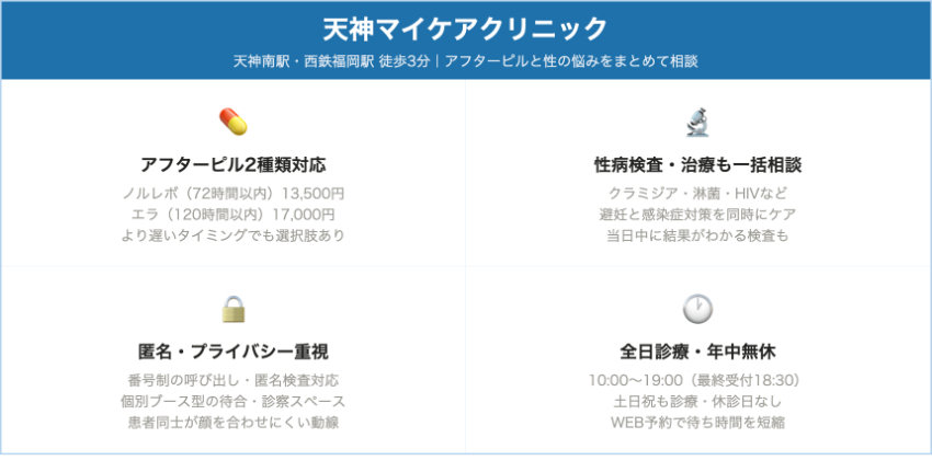 | 天神マイケアクリニック | 天神南・西鉄福岡/今泉・ロクラス今泉4F | ノルレボ 13,500円 | エラ 17,000円 | ピル初診料1,650円別途 → 初回約15,150円〜 | 性病検査とセットで相談しやすい性の総合クリニック。年中無休・19時まで診療で時間の融通が利きやすい。 |