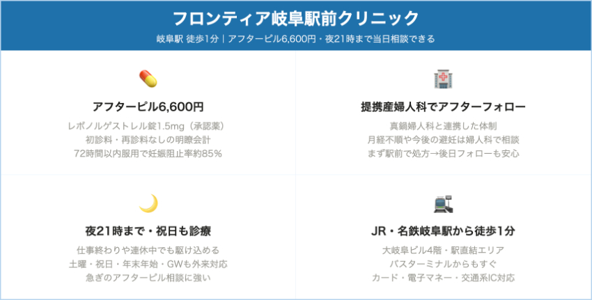| フロンティア岐阜駅前クリニック | 岐阜市・JR岐阜駅/名鉄岐阜駅徒歩1分 | レボノルゲストレル1.5mg錠(緊急避妊薬) | 6,600円(税込)|診察料・再診料不要と明記 | 駅徒歩1分・夜21時まで・土祝も診療。内科だがアフターピル専門ページあり。 |