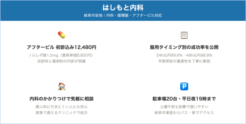 | 医療法人社団明徳会 はしもと内科 | 岐阜市岩地(岐阜市東部・前一色東バス停付近) | ノルレボ錠1.5mg(レボノルゲストレル) | 初診+ノルレボ1錠:12,480円(税込)/ノルレボ1錠:8,800円(税込) | 内科だが自費治療ページで緊急避妊(アフターピル)を明記。服用タイミング別の成功率もブログで解説。 |