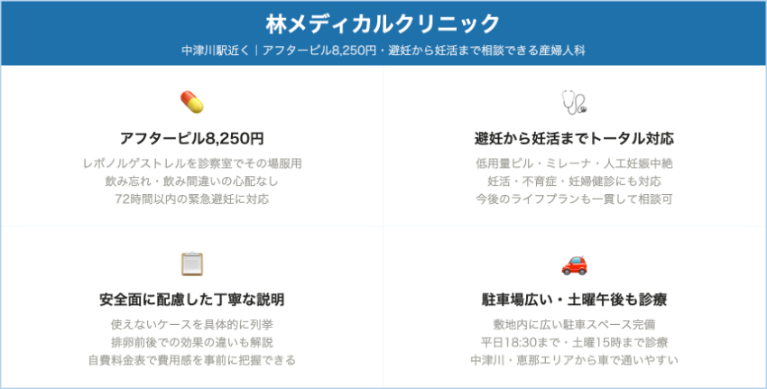 | 林メディカルクリニック | 中津川市新町・中津川駅周辺 | レボノルゲストレル(緊急避妊用ピル) | 8,250円(税込)(税抜7,500円+消費税) | 産婦人科・内科。自費料金表で緊急避妊用ピルを明記。診察室で内服させる運用で飲み忘れ防止。 |