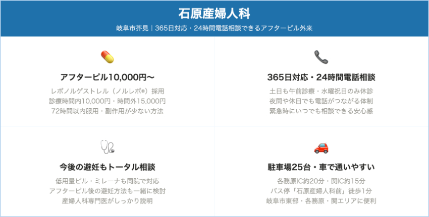| 石原産婦人科 | 岐阜市芥見嵯峨(各務原寄り) | レボノルゲストレル(ノルレボ®) | 10,000円(税込)(診療時間内)/15,000円(税込)(時間外) | 産科・婦人科。365日対応・24時間電話相談可。低用量ピルやミレーナも同院で相談可。 |