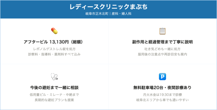 - 岐阜市周辺におけるアフターピルの費用相場(薬代+診察料込みで約8,000円〜20,000円程度)を把握できる