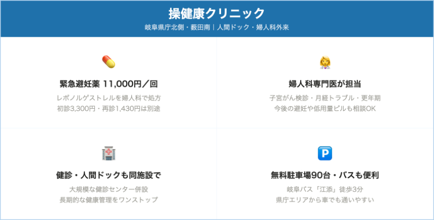 | 操健康クリニック | 岐阜市薮田南・岐阜県庁北エリア | 緊急避妊薬(レボノルゲストレル) | 11,000円(税込)/1回(薬代)+ 初診3,300円/再診1,430円/妊娠検査2,200円 など | 総合健診施設内の婦人科外来。婦人科自費料金表が充実しており、トータル費用をイメージしやすい。 |