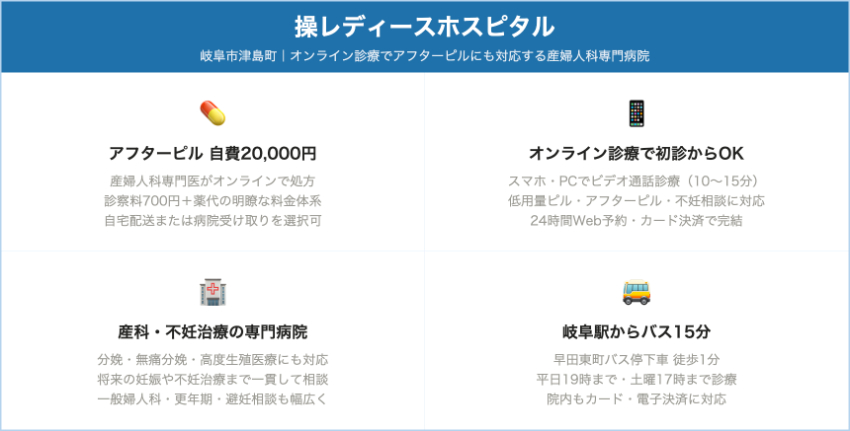 | 医療法人セントポーリア 操レディースホスピタル | 岐阜市津島町(岐阜駅からバス約15分) | アフターピル(オンライン診療・自費) | アフターピル 20,000円(自費)+オンライン診察料 700円(税込) | 産婦人科ホスピタル。オンライン診療でピル・アフターピル処方、自宅配送可。支払いはクレジットカード対応。 |