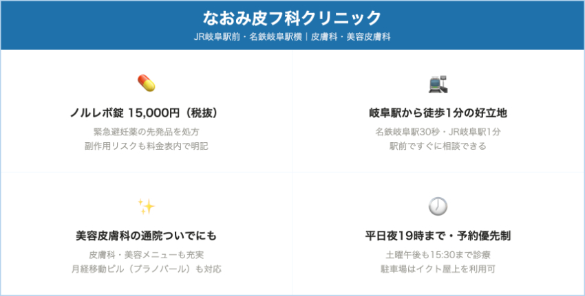 | なおみ皮フ科クリニック | 岐阜市神田町・JR岐阜駅/名鉄岐阜駅すぐ | 緊急避妊薬 ノルレボ錠 | 15,000円(税抜)/1錠 | 皮膚科・美容皮膚科だが料金表にノルレボを掲載。副作用も具体的に記載。現金払いが基本。 |